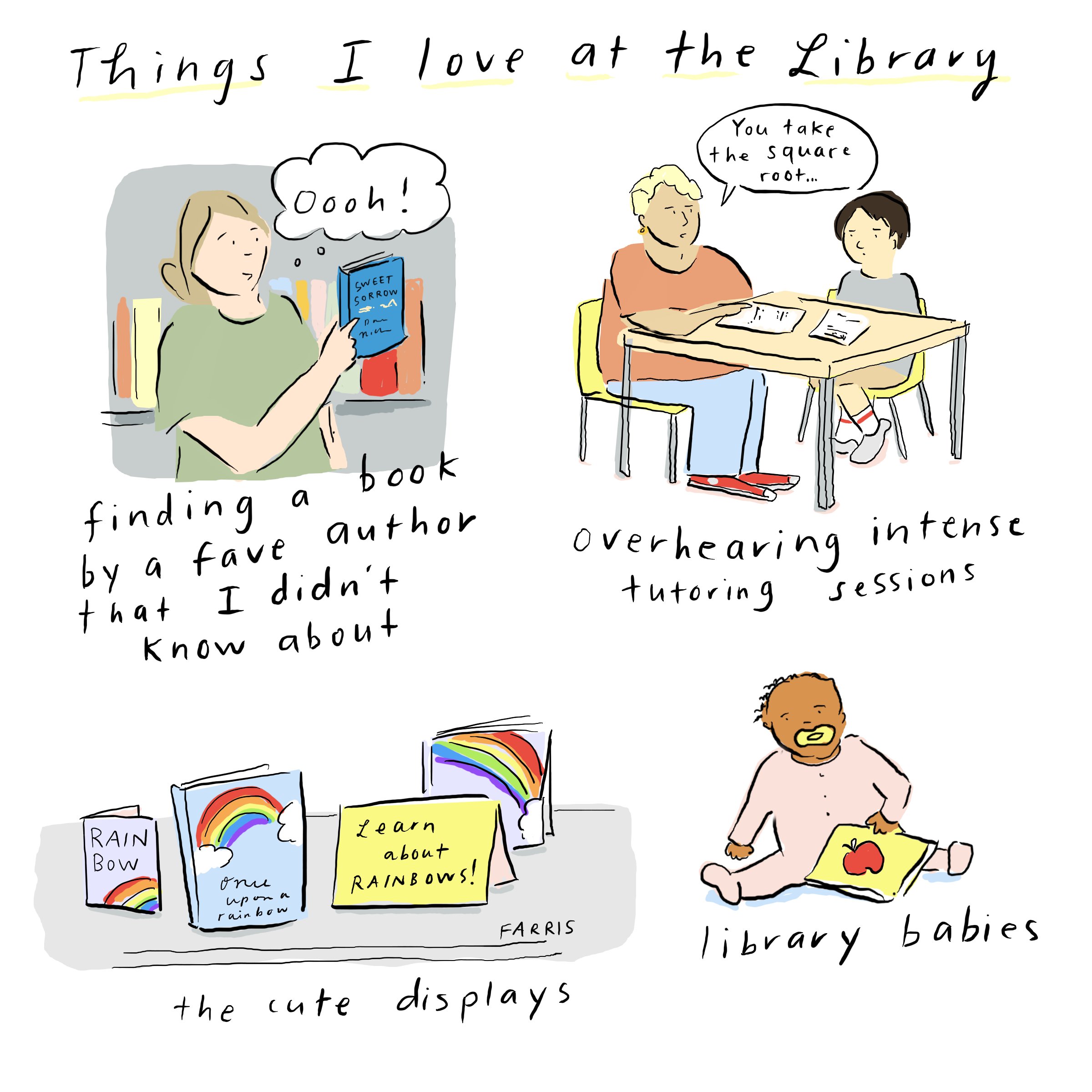 There are SO many reasons to love libraries, what an excellent illustration today. I was in the cookbook section of my Berkeley library last weekend and ran into W. Kamau Bell, we had a lovely exchange and he checked out a cookbook I recommended! Even famous people use the library :)